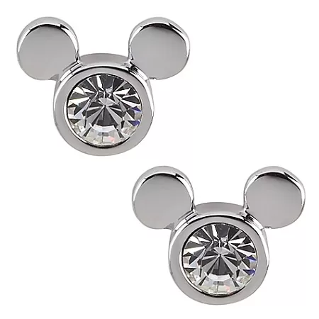 Dazzling, yet subtle Mickey Mouse Clear Icon Earrings by Arribas feature Mickey’s head with a Swarovski crystal nestled into a rhodium plate setting and Mickey ears. Setting has ”Disney” etched along bottom opposite of ears.