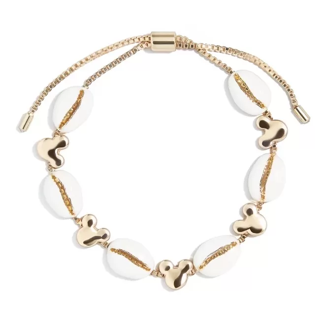 Alternating Mickey icons and faux puka shells create a striking contrast on this elegant bracelet by BaubleBar. Strung on a brass box link chain with goldtone finish, it features a pull tie adjustable closure for a perfect fit.