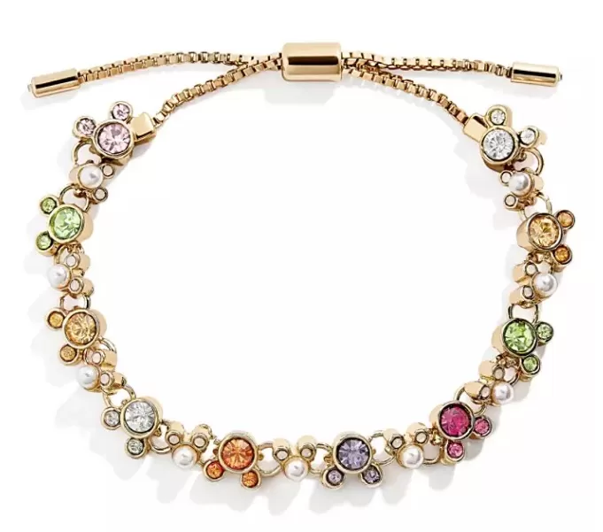Mickey Mouse brings his colorful personality to this dazzling bracelet by BaubleBar. Multiple Mickey icons fashioned from faceted glass string together on the goldtone box link chain to create jewelry with real character.