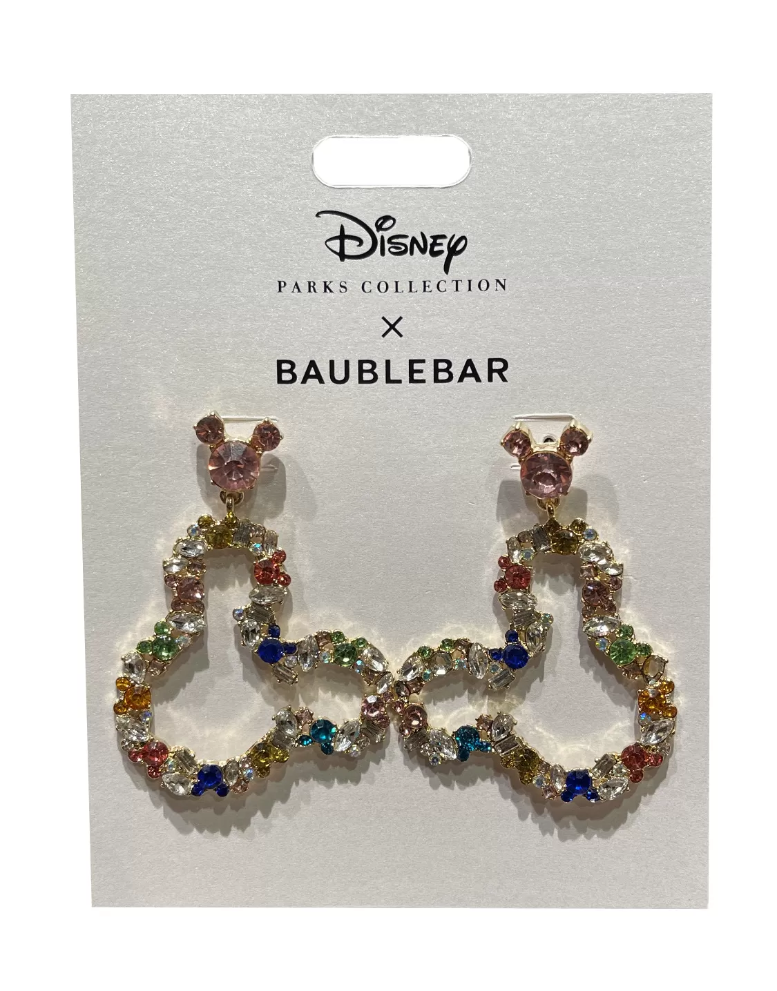 These gorgeous pair of dazzling earrings by BaubleBar Features Multiple colorful Mickey icons fashioned from faceted glass string together to outline one large icon which hangs from the pearlescent stud.