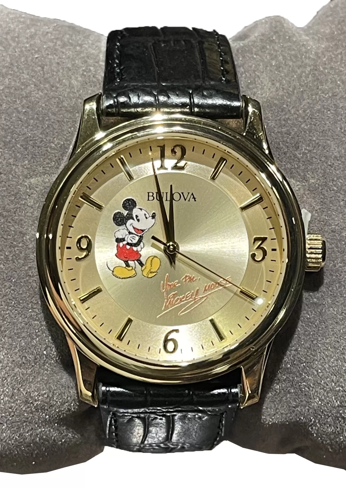 You’ll love spending time with ”Your pal, Mickey Mouse” who is featured on this elegant watch by Bulova. He also brings a personal touch with his ”signature” on the dial of this goldtone stainless steel case that’s complemented by the black leather strap.