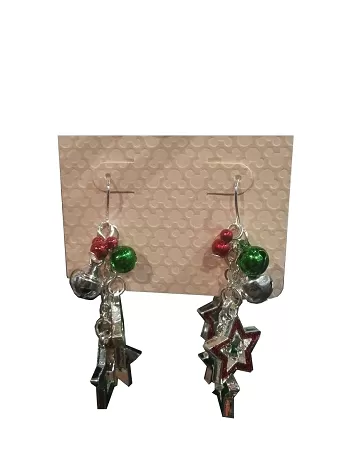Dazzle up this Christmas with these beautiful dangling silver earrings, with Stars outlined in red, and accented with silver and green bells and red Mickey Icon.