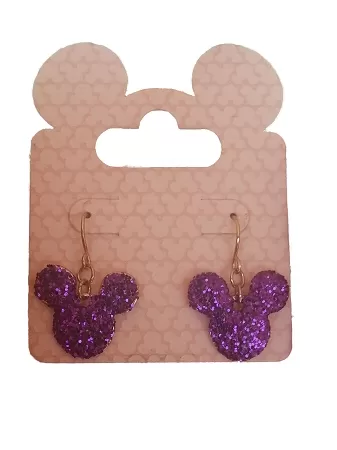 these beautiful Mickey Mouse Icon Earrings, Features Mickey Mouse Icons full of purple glitter on gold french wire hooks.