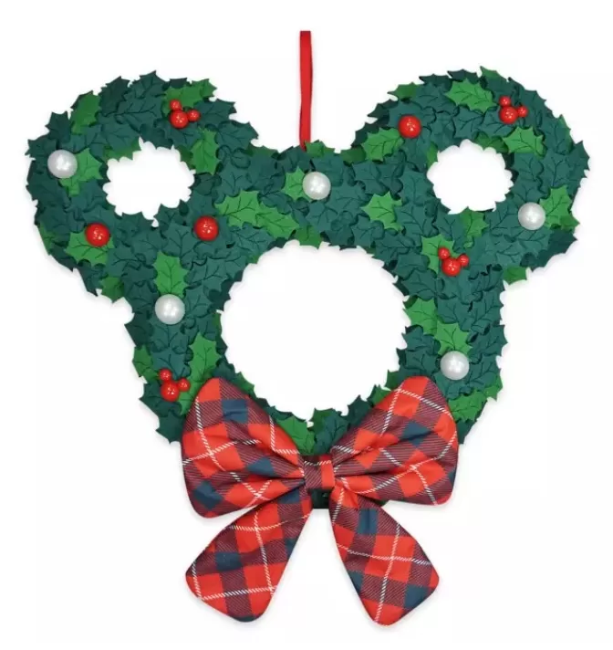 Layers of green felt leaves make for a festive Mickey Mouse Icon Wreath that will add holiday cheer to your décor. In addition to red and white beads, a soft plaid bow makes this wreath even more merry.