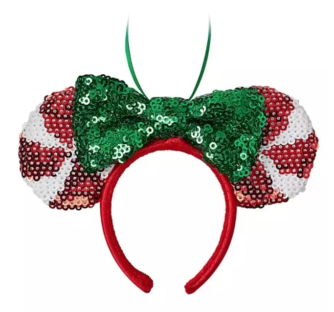Add a novel twist to your holiday décor with this Minnie Mouse Ear Headband Ornament. The miniature version of the classic sequin design features peppermint twist ears and green bow.