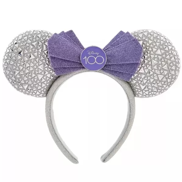 - Glittering purple bow with metal Disney100 logo centerpiece