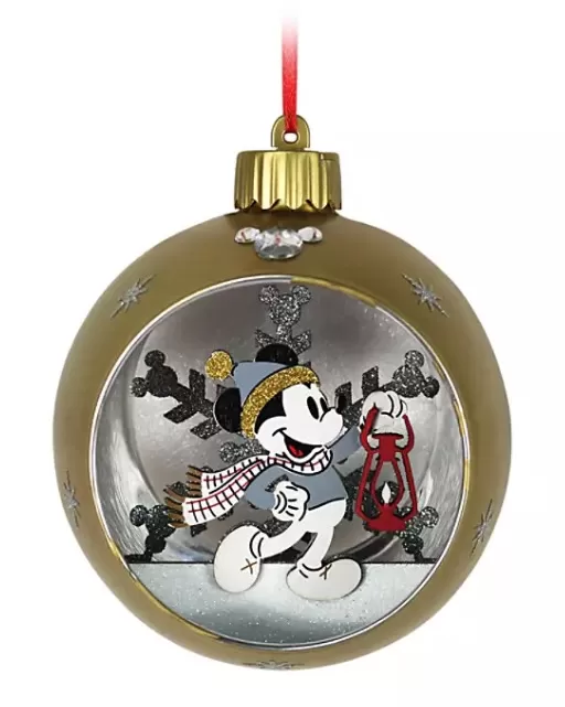 Our frosted glass ball ornament lights-up your life from a clear picture window, illuminating Mickey Mouse and a glittering snowflake. Stardust and faceted gem accents add an extra touch of elegance to this heirloom treasure.