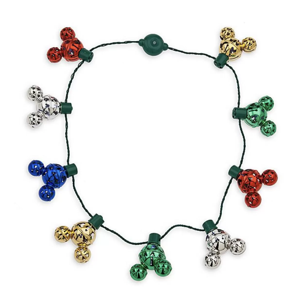 Ring in the holiday season with this festive necklace. The circle of colorful Mickey icon jingle bells lights up so it’s not only your tree that will be trimmed. Mickey icon cutouts in the bells add extra character.