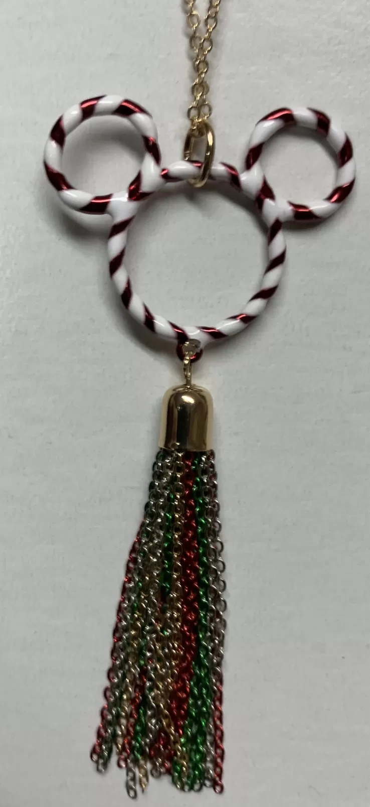 Dress for the Holidays with this fun Festive Necklace. Features a Mickey Mouse Icon in a Peppermint design, with a colorful tassel underneath, of Green, Red and Gold.