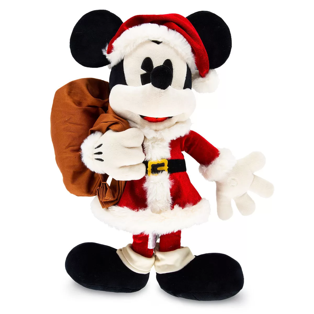The stockings were hung by the chimney with care in the hopes that Mickey Mouse soon would be there! Soft plush Mickey delivers the goods in his vintage Santa suit with sack.