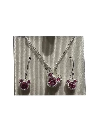 Mickey gives you a fashion statement with these silver earrings and chain necklace with pink mouse icon pendant.