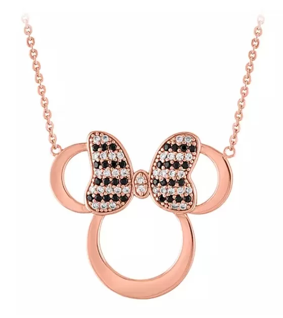 Sparkling stripes of clear and black cubic zirconia decorate the bow on this Minnie Mouse icon necklace. Crafted in sterling silver with a rose gold finish by Rebecca Hook, it’s the perfect accent for any occasion.