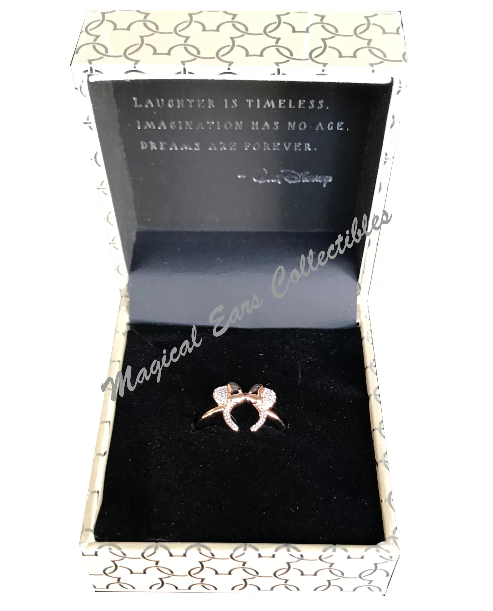 Modern Mouseketeers will cheer for this gorgeous ring in the form of a Minnie Mouse ear headband. With sparkling rhinestone gems ringing a rose gold finish bow, this playful piece is another prize from designer Rebecca Hook.