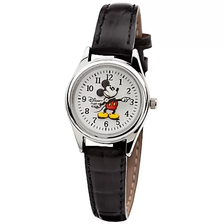 Keep a date to watch the hours go by wearing a classic Mickey Mouse watch with traditional gloved hands. This model features a white face and silvertone casing with an elegant black faux gator band, sized for a lady’s wrist.