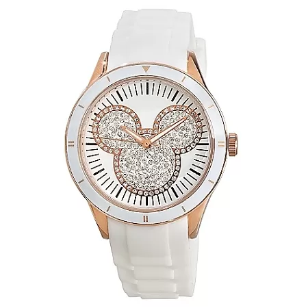Our fa-mouse icon sparkles brightly on the face of our lovely Mickey Mouse watch direct from the Disney Parks. This fine watch features a white silicon band for durability as well as Japanese movement and gold-plated accents.